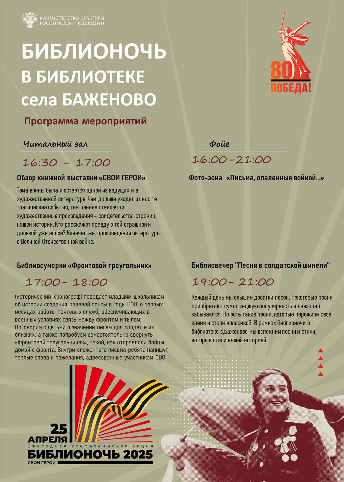25 апреля 2025 года библиотека села Баженово поддержит Всероссийскую акцию «Библионочь-2025», которая в юбилейный год Победы пройдет под названием «Свои герои» и девизом «Нет в России семьи такой, где б не памятен был свой герой».